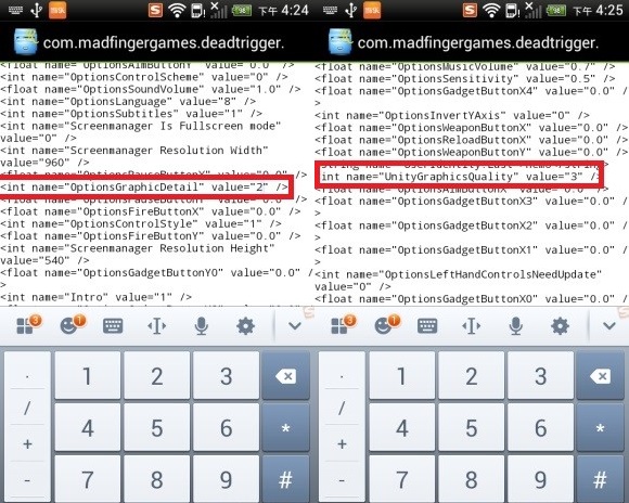 长按com.madfingergames.deadtrigger2.xml文件,然后使用文本编辑器打开,将 int name="UnityGraphicsQuality" value="0" 改为int "UnityGraphicsQuality" value="3" ,同理,再将 int name="OptionsGraphicDetail" value="1" 改为 int name="OptionsGraphicDetail" value="2" ,然后保存即可。
