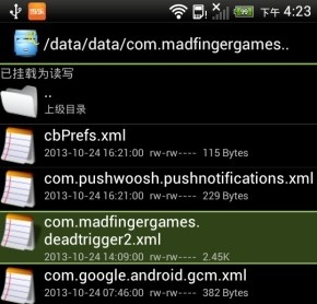 想要修改特效,首先你的设备需要已经ROOT,然后使用文件管理器打开手机根目录下的:data/data/com.madfingergames.deadtrigger2/shared_prefs文件夹,这里以《RE文件管理器》为例。