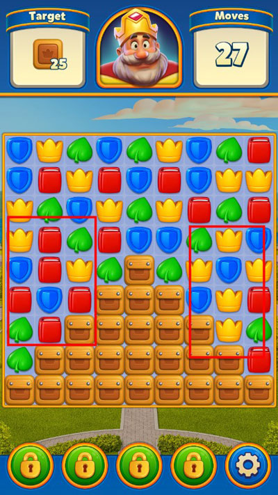 3、相同颜色的物品组合在一起可以消灭掉锁起来的箱子,但是一定要注意剩余的步数,步数用完没能消灭所有箱子即为通关失败
