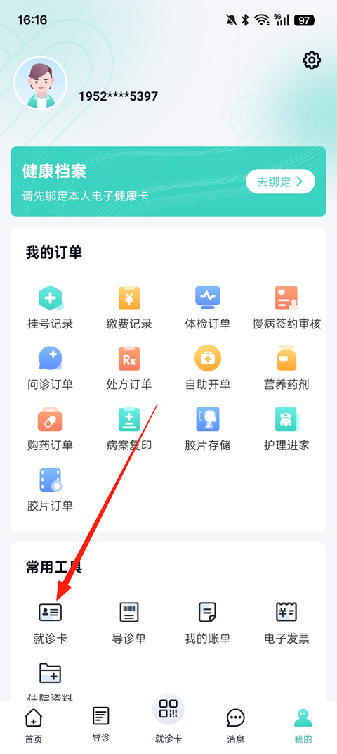 2、然后点击【就诊卡】